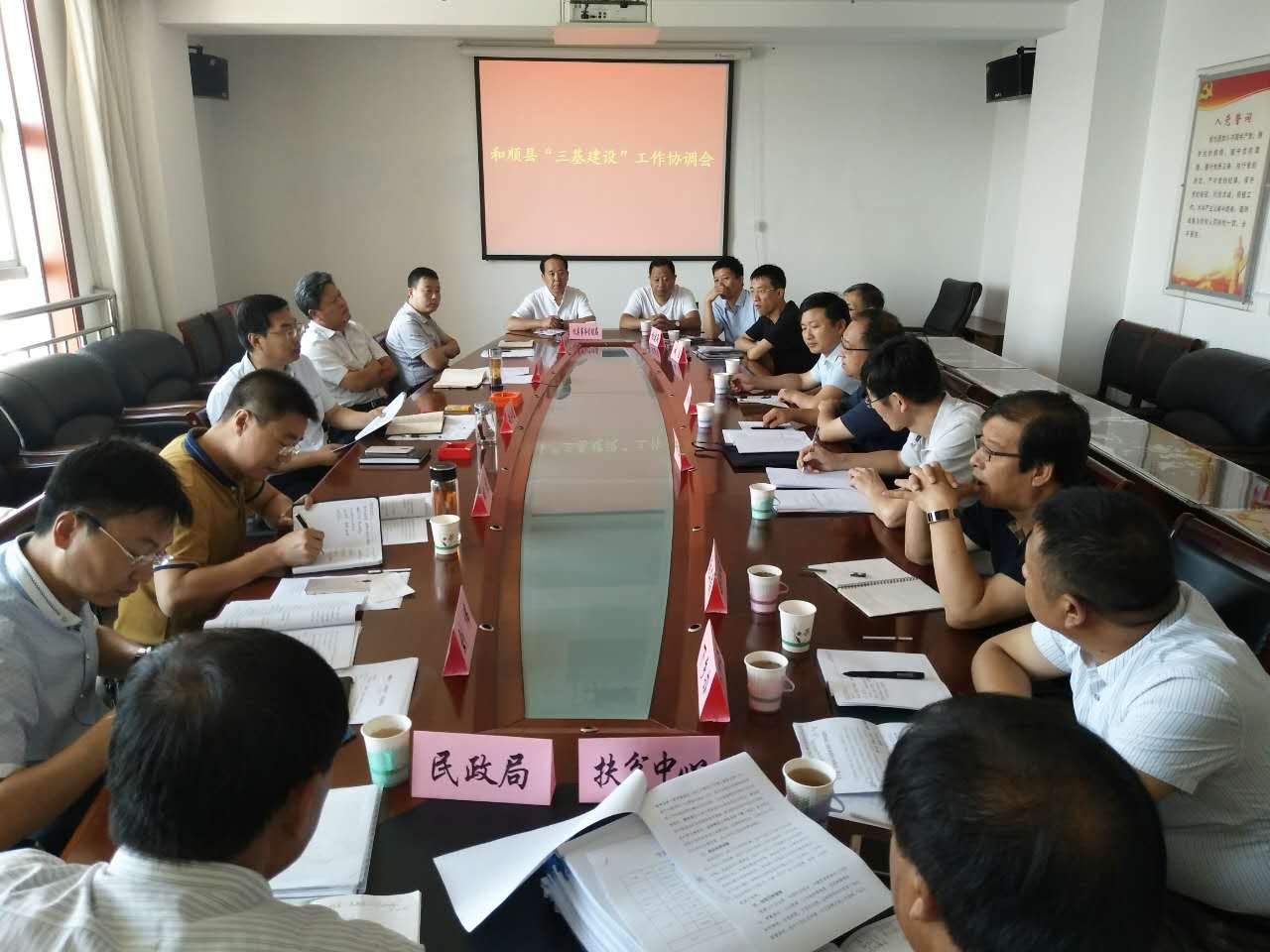8月10日,和顺县召开“三基建设”工作协调会,研究部署加强“三基建设”财政投入保障力度、加快社区活动场所建设进度、强化干部驻村帮扶管理、推动“并村简干”顺利开展等方面工作。县财政局、人社局、国土局、住建局、机关事务管理局、扶贫中心、农委、城区等有关单位负责人参加会议,县委常委、组织部长赵江波出席会议并讲话。会上,与会人员围绕各项工作进行了充分的讨论研究,进一步明确了各自工作任务,加强了相互间的协调配合。